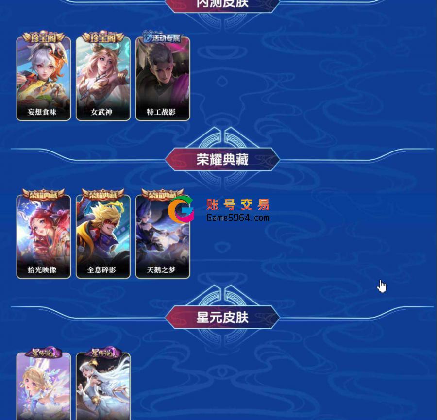• 贵族9 皮肤价值:336360 荣耀典藏3 传说皮肤36 史诗皮肤121 英雄110 皮肤388 荣耀王者