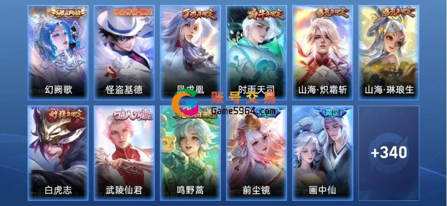 庄周-高山流水,妲己-时之彼端,暃-埋骨钱,镜-青焰无极,姬小满-妄想食味,蒙恬-荣光圣徽,蒙犽-百解令,司空震-地狱燃心,阿古朵-江河有灵,戈娅-驭风魔法,吕布-御风骁将,暃-星界游侠,马可波罗-山海·玄木吟,梦奇-顽趣,元歌-无心,孙悟空-孙行者,钟无艳-超时空战士,鬼谷子-五谷丰年,狂铁-电玩高手,铠-青龙志,明世隐-吟游魔法,百里玄策-原初追逐者,黄忠-火炮绅士,韩信-傲雪梅枪,雅典娜-黎明之约,花木兰-青春决赛季,嫦娥-拒霜思,干将莫邪-真爱魔法,马超-神威,杨玉环-遇见飞天,老夫子-航海奇遇记,嬴政-优雅恋人,韩信-逐梦之影,伽罗-天狼溯光者,元歌-云间偶戏,云中君-纤云弄巧,孙悟空-大圣娶亲,裴擒虎-李小龙,蔡文姬-繁星吟游,马可波罗-暗影游猎,阿轲-迷踪丽影,赵云-龙胆,孙悟空-至尊宝,兰陵王-驯魔猎人,上官婉儿-梁祝,鲁班七号-狮舞东方,狄仁杰-魔术师,赵云-皇家上将