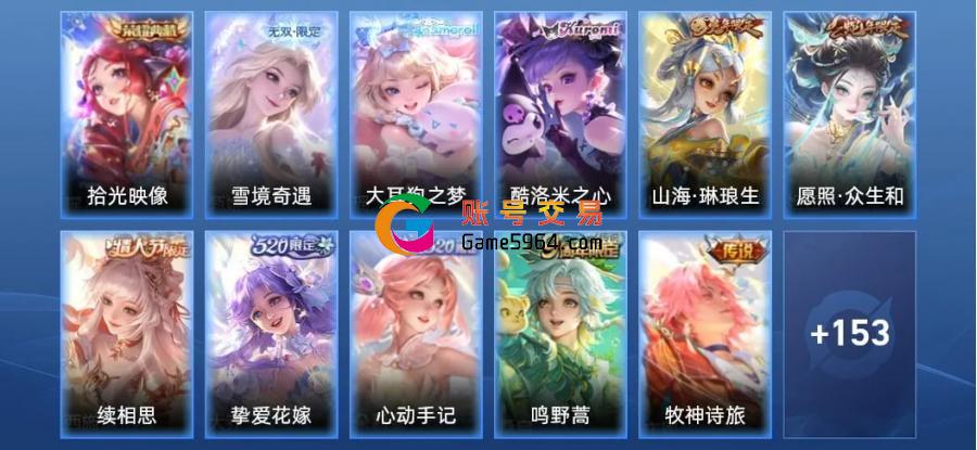 瑶-拾光映像,廉颇-功夫炙烤,明世隐-占星师,程咬金-功夫厨神,甄姬-花好人间,沈梦溪-棒球奇才,刘禅-天才门将,嫦娥-露花倒影,杨玉环-霓裳曲,雅典娜-黎明之约,安琪拉-酷洛米之心,阿古朵-布丁狗之约,瑶-大耳狗之梦,朵莉亚-金色潮汐,达摩-大发明家,张良-灵野札记,小乔-丁香结,李信-灼热之刃,阿轲-化蝶舞,王昭君-偶像歌手,西施-续相思,戈娅-玫蓝誓约,马超-访茗客,孙膑-茶境仙,孙尚香-末日机甲,嬴政-摇滚巨星,明世隐-景韶洛都,女娲-尼罗河女神,鬼谷子-阿摩司公爵,妲己-愿照·众生和,沈梦溪-鲨炮海盗猫,狄仁杰-阴阳师,墨子-龙骑士,姜子牙-星梦巡礼,东皇太一-金福满堂,赵怀真-器灵·浮梦炉,蔡文姬-愿照·福禄聚,马超-幸存者,甄姬-雪境奇遇,金蝉-前尘,太乙真人-谧流熔炉,西施-雪境奇遇,戈娅-危途狂花,达摩-拳王,武则天-东方不败,干将莫邪-雾都夜雨,宫本武藏-未来纪元,桑启-鸣野蒿,露娜-紫霞仙子,孙策-猫狗日记,小乔-山海·琳琅生,西施-至美·乘鲤谣,艾琳-陌上桑,大乔-白蛇,东皇太一-噬灭天穹,马可波罗-星界特工,庄周-牧神诗旅,孙悟空-神迹守卫,亚连-破空之剑,李白-谪仙醉月,亚瑟-动物派对,赵云-忍·炎影,鲁班七号-黑桃队长,妲己-时之彼端,弈星-炽弈燎原,大乔-猫狗日记,钟无艳-海滩丽影,貂蝉-圣诞恋歌,大司命-东方月初,少司缘-涂山红红,妲己-女仆咖啡,蔡文姬-夏日便利店,鲁班大师-乓乓大师,艾琳-女武神,米莱狄-完美假期,大乔-绒语心约,姜子牙-天穹之誓,虞姬-夏日便利店,兰陵王-暗隐猎兽者,哪吒-次元突破,韩信-教廷特使,周瑜-熔金海岸,明世隐-夜落电台,孙膑-小动物乐团,白起-星夜王子,弈星-滕王阁序,宫本武藏-鬼剑武藏,杨戬-破阵·退雄兵,安琪拉-魔法小厨娘,廉颇-地狱岩魂,镜-青焰无极,王昭君-精灵公主,朵莉亚-心动手记,项羽-苍威无极,王昭君-幻想奇妙夜,海诺-心动手记,小乔-缤纷独角兽,刘备-异域游侠,瑶-遇见神鹿,大司命-暗都幽影,大乔-挚爱花嫁,阿轲-节奏热浪,花木兰-兔女郎,刘邦-剑破天穹,蔡文姬-舞动绿茵,张飞-五福同心,鲁班七号-蔬乡物语,钟无艳-春野之旅,李元芳-蔬乡物语,云缨-赤焰之缨,吕布-圣诞狂欢,露娜-瓷语鉴心,梦奇-美梦成真,盾山-圆桌骑士,狄仁杰-魔术师,大乔-乘龙·忆丹青,杨玉环-寅虎·心曲,项羽-帝国元帅,大乔-伊势巫女,云中君-纤云弄巧,鬼谷子-天穹祈灯,公孙离-玉兔公主,百里守约-特工魅影,上官婉儿-修竹墨客,公孙离-花间舞,嫦娥-拒霜思,蒙犽-百解令,甄姬-冰雪圆舞曲,墨子-金属风暴,明世隐-虹云星官,张良-古海寻踪,李元芳-妄想特派,安琪拉-心灵骇客,瑶-森,鲁班大师-探海日志,艾琳-奇遇舞章,姬小满-零食大作战,西施-游龙清影,西施-玲珑珍味,伽罗-花见巫女,刘备-万事如意,赵云-皇家上将,弈星-踏雪寻梅,太乙真人-劲辣红锅,裴擒虎-擒涛扼浪,孙尚香-沉稳之力,鬼谷子-五谷丰年,孙尚香-水果甜心,桑启-海盐诗旅,曜-归虚梦演,西施-归虚梦演,扁鹊-救世之瞳,貂蝉-异域舞娘,夏侯惇-乘风破浪,西施-诗语江南,貂蝉-仲夏夜之梦,项羽-海滩派对,小乔-青蛇,孙膑-归虚梦演,李元芳-云中旅人,妲己-魅力维加斯,沈梦溪-大漠名商,妲己-少女阿狸,亚瑟-死亡骑士
