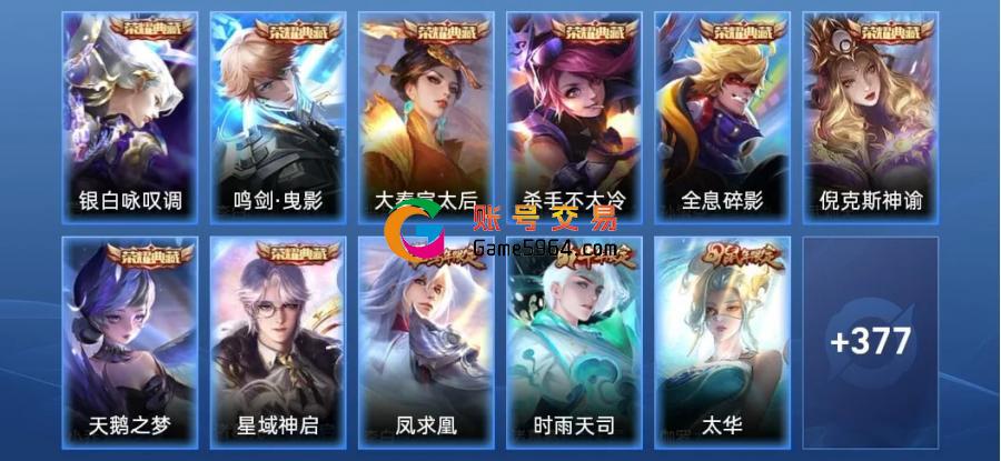 姬小满-妄想食味,司空震-地狱燃心,庄周-云端筑梦师,蒙恬-荣光圣徽,戈娅-驭风魔法,阿古朵-江河有灵,暃-星界游侠,梦奇-顽趣,元歌-无心,钟无艳-超时空战士,鬼谷子-五谷丰年,狂铁-电玩高手,明世隐-吟游魔法,露娜-一生所爱,小乔-纯白花嫁,黄忠-火炮绅士,周瑜-真爱至上,镜-匿光追影者,廉颇-寅虎·御盾,杨玉环-寅虎·心曲,雅典娜-黎明之约,干将莫邪-真爱魔法,庄周-高山流水,猪八戒-猪悟能,老夫子-航海奇遇记,米莱狄-胡桃异想国,关羽-冰锋战神,马可波罗-逐梦之星,元歌-云间偶戏,虞姬-霸王别姬,芈月-白晶晶,孙膑-天狼运算者,云中君-纤云弄巧,百里守约-朱雀志,孙悟空-大圣娶亲,裴擒虎-李小龙,蒙犽-狂想玩偶喵,百里玄策-原初追逐者,马可波罗-暗影游猎,上官婉儿-天狼绘梦者,阿轲-迷踪丽影,孙悟空-至尊宝,后羿-如梦令,嫦娥-如梦令,庄周-玄嵩,甄姬-幽恒,典韦-岱宗,韩信-飞衡,妲己-时之彼端,李元芳-银河之约,后羿-辉光之辰,曹操-天狼征服者,王昭君-凤凰于飞,蔡文姬-繁星吟游,兰陵王-驯魔猎人,上官婉儿-梁祝,鲁班七号-狮舞东方,狄仁杰-魔术师,雅典娜-神奇女侠,赵云-皇家上将