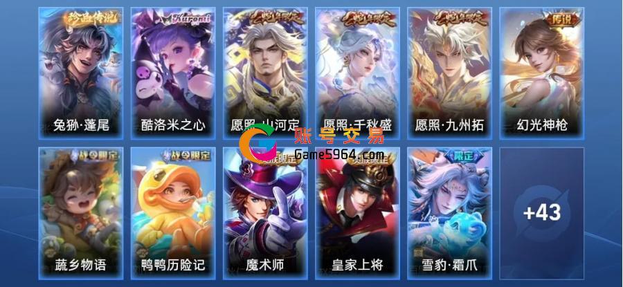 吕布-末日机甲,暃-碧珀绯影,姬小满-小满鸭,露娜-命运加冕,大司命-暗都幽影,夏侯惇-乘风破浪,赵云-白执事,程咬金-功夫厨神,鲁班七号-蔬乡物语,狄仁杰-魔术师,安琪拉-酷洛米之心,张飞-兔狲·蓬尾,阿轲-节奏热浪,孙悟空-西部大镖客,老夫子-藏狐·褐绒,沈梦溪-鸭鸭历险记,刘禅-鸭鸭历险记,赵云-皇家上将,狂铁-龙之律动,阿古朵-布丁狗之约,老夫子-潮流仙人,刘备-汉昭烈帝,百里守约-雪豹·霜爪,张良-灵野札记,老夫子-功夫老勺,海月-幻泉雾影,苏烈-春野闲踪,狄仁杰-鹰眼统帅,钟馗-虚灵犬护,司马懿-魇语军师,刘备-浪漫序章,戈娅-玫蓝誓约,关羽-龙腾万里,明世隐-景韶洛都,司空震-启蛰,马可波罗-激情绿茵,司空震-愿照·山河定,不知火舞-魅语,典韦-黄金武士,安琪拉-心灵骇客,狄仁杰-阴阳师,云缨-幻光神枪,李白-千年之狐,女娲-愿照·千秋盛,项羽-海滩派对,澜-愿照·九州拓,王昭君-偶像歌手,达摩-拳王,赵云-忍·炎影,后羿-精灵王,妲己-魅力维加斯,太乙真人-谧流熔炉,西施-雪境奇遇,亚瑟-死亡骑士
