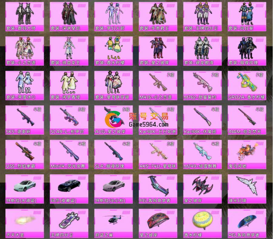 【区服】安卓QQ 【实名情况】可二次实名 【封号情况】无封号 【沉迷情况】无防沉迷 【段位】不朽星钻Ⅳ 【热力值】130758 【历史最高段位】超级王牌15星 【王牌印记】17 【卓越印记】1 【传奇印记】0 【绝世印记】0 【游戏等级】76 【当前赛季KD值】第三人称-四排 0,第三人称-双排 0,第三人称-单排 0,第一人称-四排 0,第一人称-双排 0,第一人称-单排 0, 【稀有资产数量】7 【套装数量】267 【枪械数量】325 【粉枪械数量】14 【粉套装数量】15 【载具数量】4 【飞行器数量】5 【稀有资产】套装-奇异狩猎者/套装-暗夜魅影/套装-粉红小猪/套装-雪山精英/套装-浪漫波比/套装-奇迹天团/M416-仓鼠灰灰 【粉色套装】套装-数码大师/套装-深渊皇后/套装-梦幻火箭/套装-华贵君王/套装-王牌四分卫/套装-向日葵/套装-心之恋语/套装-铁血龙王/套装-香水柠檬/套装-星之彼岸/套装-银龙傲海/套装-暗夜玫瑰/套装-霁雪冰心/套装-闲梦青缨/套装-星穹咏叹调 【粉色枪皮】M416-心之恋语[7级]/M762-甜蜜誓约[7级]/GROZA-香水柠檬[7级]/SKS-诡面斩[4级]/SCAR-L-机甲封神[5级]/AUG-星之彼岸[5级]/Kar98K-巳巳如意[5级]/Kar98K-伏魔团[4级]/AWM-焰龙焚天[4级]/VSS-烈焰拳霸[4级]/Mini14-荧光虫舞[4级]/SLR-暗夜玫瑰[4级]/AKS-74U-星穹咏叹调[5级]/M249-绒雪飘舞[4级] 【载具】鬼马风驰/特斯拉Roadster(水滴蓝)/玛莎拉蒂Quattroporte(夜幕蓝)/特斯拉Roadster(沁心粉) 【飞行器】PEL轰鸣竞梦者飞行器/星之彼岸飞行器/镜光幻境飞行翼/齐天大圣飞行器/王牌四分卫飞行器 【珍稀背包】百万伏特背包(3级)/洛神天依背包(3级)/