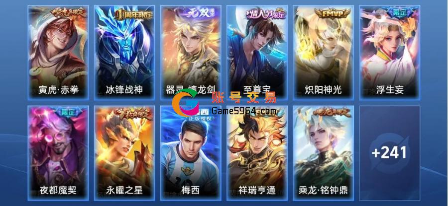 大乔-守护之力,芈月-红桃皇后,安琪拉-心灵骇客,司马懿-魇语军师,戈娅-危途狂花,刘邦-德古拉伯爵,露娜-紫霞仙子,蒙犽-胡桃狂想曲,不知火舞-魅语,孙尚香-沉稳之力,莱西奥-西部游侠,元歌-午夜歌剧院,廉颇-地狱岩魂,狂铁-命运角斗场,沈梦溪-月团寄思,蒙恬-蔚蓝守将,干将莫邪-第七人偶,后羿-阿尔法小队,吕布-圣诞狂欢,裴擒虎-街头旋风,曹操-幽灵船长,诸葛亮-掌控之力,貂蝉-圣诞恋歌,吕布-末日机甲,刘禅-秘密基地,雅典娜-冰冠公主,鲁班大师-乓乓大师,米莱狄-契约魔法,王昭君-幻想奇妙夜,哪吒-次元突破,鬼谷子-幻乐之宴,明世隐-虹云星官,程咬金-无双福将,猪八戒-潮玩探月行,弈星-踏雪寻梅,甄姬-花好人间,韩信-街头霸王,甄姬-冰雪圆舞曲,哪吒-热血海滩,典韦-黄金武士,诸葛亮-星航指挥官,赵云-白执事,刘禅-唤灵魔甲,兰陵王-隐刃,达摩-大发明家,梦奇-美梦成真,露娜-瓷语鉴心,姜子牙-炽热元素使,花木兰-水晶猎龙者,夏侯惇-乘风破浪,司空震-启蛰,李信-灼热之刃,百里守约-绝影神枪,杨玉环-霓裳曲,上官婉儿-修竹墨客,貂蝉-异域舞娘,狂铁-特工战影,白起-星夜王子,钟无艳-聚星闪耀,刘禅-电玩·爆裂旋风,亚连-破局者,张良-古海寻踪,关羽-龙腾万里,李元芳-妄想特派,嫦娥-露花倒影,姬小满-零食大作战,阿轲-暗夜猫娘,太乙真人-劲辣红锅,暃-碧珀绯影,钟无艳-海滩丽影,刘禅-天才门将,阿轲-节奏热浪,澜-赏金猎手,小乔-丁香结,白起-乐园追猎者,曜-归虚梦演,孙尚香-水果甜心,沈梦溪-鲨炮海盗猫,牛魔-牛运亨通,刘备-汉昭烈帝,橘右京-修罗,云缨-赤焰之缨,盘古-创世神祝,关羽-天启骑士,阿古朵-熊喵少女,孙膑-未来旅行,蒙恬-秩序猎龙将,刘备-万事如意,后羿-精灵王,云中君-荷鲁斯之眼,澜-孤猎,娜可露露-晚萤,镜-冰刃幻境,程咬金-功夫厨神,白起-白色死神,项羽-科学大爆炸,马超-幸存者,兰陵王-暗隐猎兽者,赵云-忍·炎影,苏烈-坚韧之力,盾山-圆桌骑士,马可波罗-激情绿茵,沈梦溪-棒球奇才,张飞-五福同心,杨戬-埃及法老,狄仁杰-鹰眼统帅,宫本武藏-万象初新,百里玄策-威尼斯狂欢,阿轲-爱心护理,猪八戒-年年有余,裴擒虎-梅西,孙策-海之征途,达摩-拳王,扁鹊-化身博士,老夫子-功夫老勺,公孙离-花间舞,曹操-死神来了,韩信-教廷特使,妲己-少女阿狸,张良-一千零一夜,刘备-纽约教父,妲己-魅力维加斯,亚瑟-死亡骑士