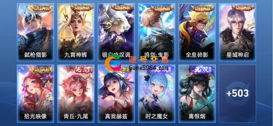 阿轲-迷踪丽影,甄姬-游园惊梦,李元芳-银河之约,弈星-炽弈燎原,兰陵王-驯魔猎人,少司缘-涂山红红,大司命-东方月初,孙尚香-蔷薇恋人,暃-埋骨钱,鲁班七号-狮舞东方,镜-青焰无极,海诺-心动手记,关羽-决胜骁骑,典韦-蓝屏警告,庄周-云端筑梦师,鲁班七号-蔬乡物语,嬴政-白昼王子,大乔-乘龙·忆丹青,安琪拉-乘龙·聚宝船,伽罗-琥珀纪元,高渐离-燃音魔法,蒙恬-荣光圣徽,蒙犽-百解令,米莱狄-胡桃异想国,司空震-地狱燃心,阿古朵-江河有灵,裴擒虎-天狼狩猎者,干将莫邪-冰霜恋舞曲,曹操-天狼征服者,赵怀真-鹤归松栖,雅典娜-黎明之约,戈娅-驭风魔法,赵云-引擎之心,扁鹊-奇幻香踪,马可波罗-暗影游猎,黄忠-烈魂,赵云-龙胆,张飞-虎魄,韩信-飞衡,瑶-山海·碧波行,马可波罗-山海·玄木吟,暃-星界游侠,梦奇-顽趣,元歌-无心,雅典娜-神奇女侠,上官婉儿-神器·万象笔,钟无艳-超时空战士,典韦-岱宗,盾山-梦圆繁星,鬼谷子-五谷丰年,鲁班大师-匿光启智者,狂铁-电玩高手,百里玄策-原初追逐者,金蝉-唐三藏,夏侯惇-匿光决锋者,明世隐-吟游魔法,赵云-百木心枪,露娜-一生所爱,云中君-时之祈愿,周瑜-真爱至上,小乔-纯白花嫁,后羿-如梦令,嫦娥-如梦令,杨玉环-寅虎·心曲,孙膑-寅虎·展翼,廉颇-寅虎·御盾,嬴政-优雅恋人,韩信-傲雪梅枪,黄忠-火炮绅士,花木兰-青春决赛季,甄姬-女儿国国王,镜-匿光追影者,嫦娥-拒霜思,干将莫邪-真爱魔法,孙悟空-孙行者,杨玉环-遇见飞天,庄周-高山流水,马超-神威,老夫子-航海奇遇记,公孙离-蜜橘之夏,鲁班七号-乒乒小将,大乔-白鹤梁神女,伽罗-天狼溯光者,王昭君-凤凰于飞,云中君-纤云弄巧,狄仁杰-魔术师,裴擒虎-李小龙,孙悟空-大圣娶亲,蔡文姬-繁星吟游,上官婉儿-天狼绘梦者,孙悟空-至尊宝,赵云-皇家上将