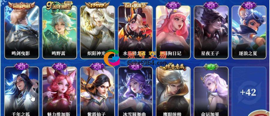 贵族贵5 荣耀典藏1 传说皮肤2 史诗皮肤9 皮肤数量55 皮肤价值:...¥417.00
