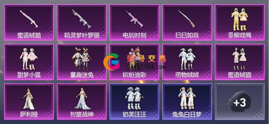 套装-垂柳戏鸭,套装-甜梦小狐,套装-奶芙汪汪,套装-兔兔白日梦,套装-童趣迷兔,套装-动感兔斯基人偶服,套装-缤纷油彩,套装-胖达圆圆,套装-深海小丑鱼,套装-萌物绒绒,套装-蜜语绒猫,角色-萨利娅,角色-智耀战神 SPAS-12-蜜语绒猫,Mk14-精灵梦叶罗丽,M416-电玩时刻,Kar98K-巳巳如意