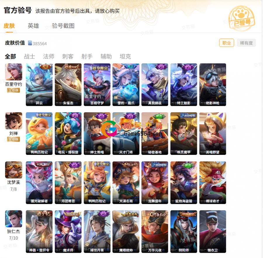 V10 3典藏 5星传说 65传说 155史诗 485皮肤 无双王者...¥2710.00